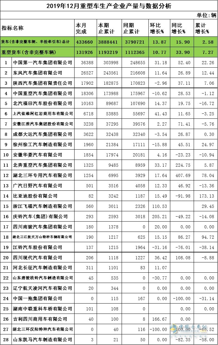 2019年12月重卡企業(yè)產(chǎn)量與數(shù)據(jù)分析