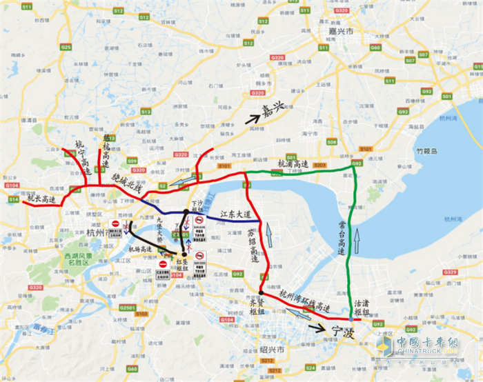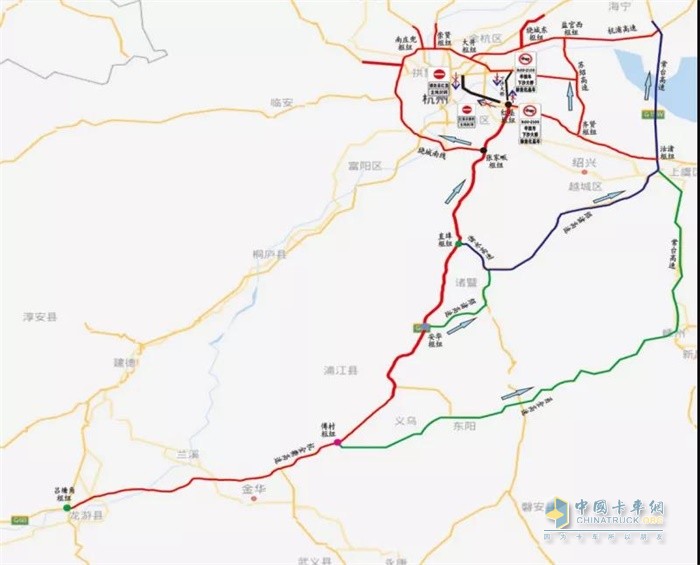 四、江西、衢州往返上海、江蘇方向的車輛:杭金衢高速—呂塘角樞紐—溧寧高速—杭新景高速—杭州繞城高速。
