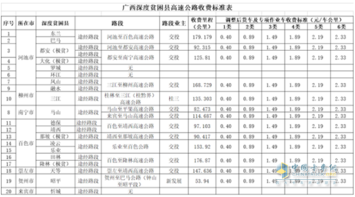 《方案》明確,自2020年5月25日起至2022年12月31日期間,停止收取河池至百色、河池至都安、三江至柳州、馬山至平果、來(lái)賓至馬山、百色至靖西、靖西至那坡、百色至隆林、樂(lè)業(yè)至百色、崇左至靖西、賀州至巴馬(鐘山至昭平段)以及桂林至三江高速公路貨車橋隧車輛通行費(fèi)。此次調(diào)整中涉及的橋隧共計(jì)146座,免收費(fèi)里程190.409公里。