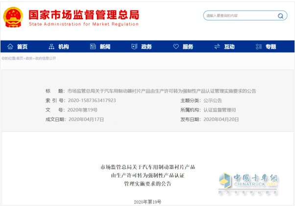 2020年6月1日起:制動襯片納入3C強制認證管理