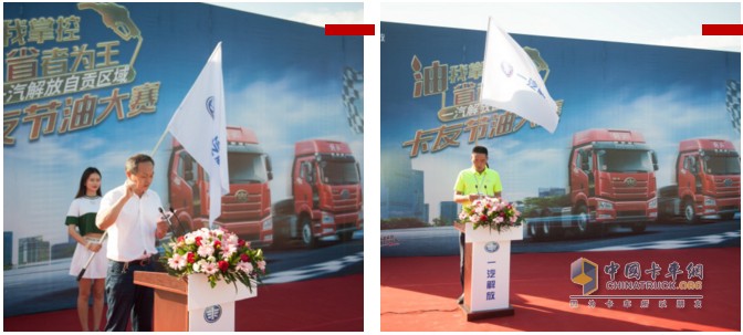 步入比賽現(xiàn)場(chǎng),首先映入眼簾的就是整齊擺放在發(fā)車(chē)區(qū)的20輛比賽用車(chē),紅色顏色的車(chē)身在藍(lán)天白云的映照下盡顯王者之姿,格外威武。伴著激昂的開(kāi)場(chǎng)音樂(lè),本次節(jié)油大賽正式拉開(kāi)帷幕!比賽發(fā)車(chē)儀式開(kāi)始,一汽解放汽車(chē)銷(xiāo)售有限公司四川商代處姜文卿經(jīng)理登臺(tái)致辭。姜經(jīng)理講到,一汽解放從“第一輛”到“第一名”,可以說(shuō)是中國(guó)汽車(chē)工業(yè)當(dāng)之無(wú)愧的開(kāi)拓者。本次節(jié)油大賽,參賽選手們也將用自己的實(shí)力證明,擁有解放是自己不后悔的選擇。同時(shí)希望通過(guò)節(jié)油大賽總結(jié)卡友們的節(jié)油心得,廣惠大眾,讓解放卡車(chē)真正的成為卡友們的掙錢(qián)機(jī)器。