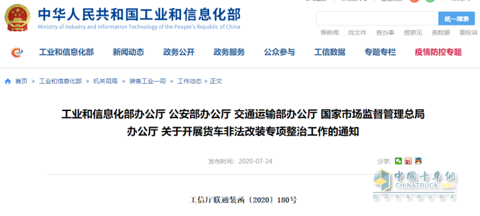 按照國務(wù)院安委會《全國安全生產(chǎn)專項整治三年行動計劃》(以下簡稱《行動計劃》)部署和《道路運輸安全專項整治三年行動實施方案》(以下簡稱《實施方案》)要求,工業(yè)和信息化部、公安部、交通運輸部、市場監(jiān)管總局決定自2020年7月至2021年5月組織開展貨車非法改裝專項整治工作,預(yù)防和遏制貨車非法改裝行為,保障道路運輸安全。具體事項通知如下。