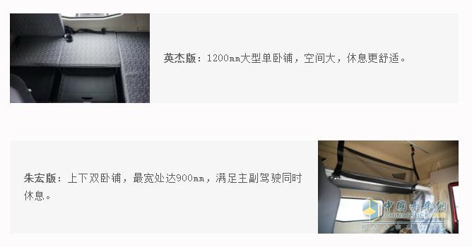 根據(jù)兩款車型的使用工況,英杰版與朱宏版在臥鋪設計上也大不一樣,英杰版500采用的是超寬的單臥鋪,適合夫妻和單人駕駛;朱宏版500則是采用上下雙臥鋪,下臥鋪雖然比不上英杰版,但也寬達900mm,在休息配置上卡友也可以根據(jù)自己的需求進行不同的選擇。