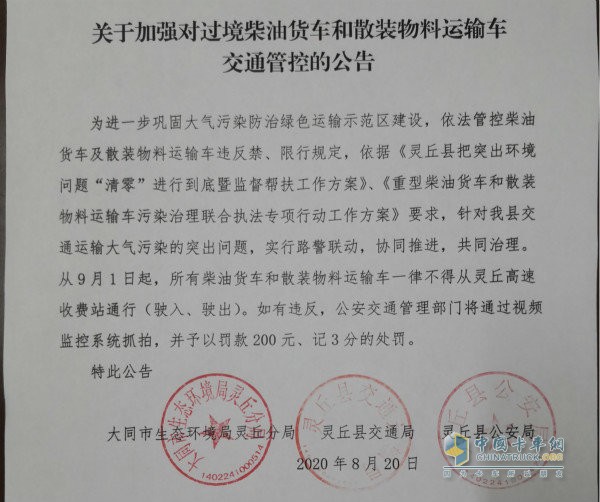日前,山西大同市生態(tài)環(huán)境局靈丘分局、靈丘縣交通局、靈丘縣公安局聯(lián)合發(fā)布《關(guān)于加強(qiáng)對(duì)過(guò)境柴油貨車(chē)和散裝物料運(yùn)輸車(chē)交通管控的公告》,表示從2020年9月1日起,所有柴油貨車(chē)和散裝物料運(yùn)輸車(chē)一律不得從靈丘高速收費(fèi)站通行,包括駛?cè)搿Ⅰ偝觥?/p>