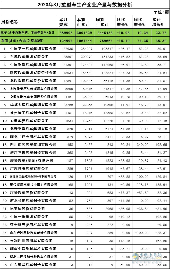 2020年8月重卡企業(yè)產(chǎn)量與數(shù)據(jù)分析