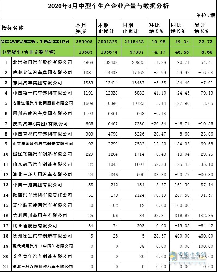 2020年8月份中型貨車完成產(chǎn)量13685,環(huán)比增長-4.17%,同比增長46.68%,累計(jì)增長8.6%。排名前三的企業(yè)為北汽福田汽車股份有限公司、東風(fēng)汽車集團(tuán)有限公司、成都大運(yùn)汽車集團(tuán)有限公司。