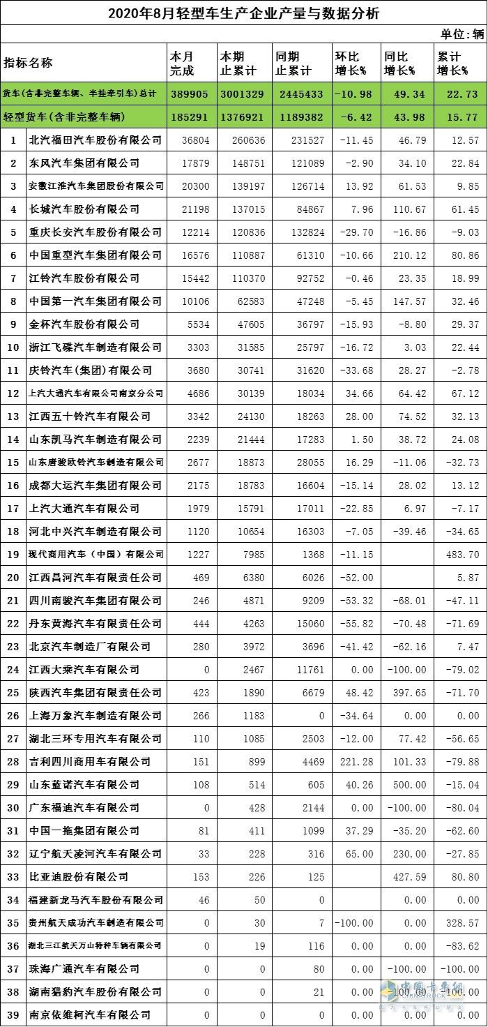 2020年8月輕卡企業(yè)產(chǎn)量與數(shù)據(jù)分析