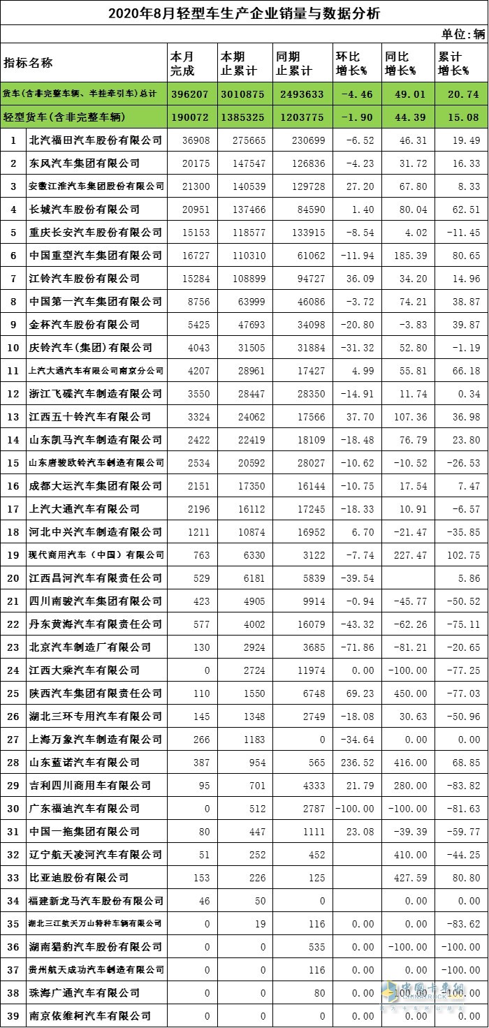 2020年8月輕卡企業(yè)銷量與數(shù)據(jù)分析