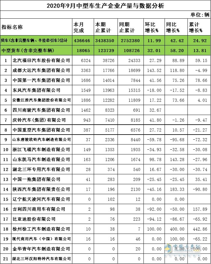 2020年9月份中型貨車完成產(chǎn)量18065,環(huán)比增長32.01%,同比增長58.2%,累計(jì)增長13.81%。排名前三的企業(yè)為北汽福田汽車股份有限公司、成都大運(yùn)汽車集團(tuán)有限公司、安徽江淮汽車集團(tuán)有限公司。