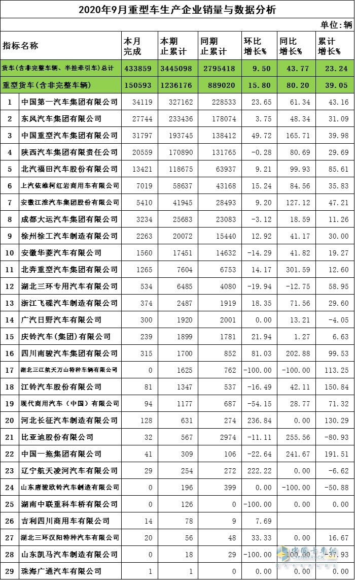 2020年9月重卡企業(yè)銷量與數(shù)據(jù)分析