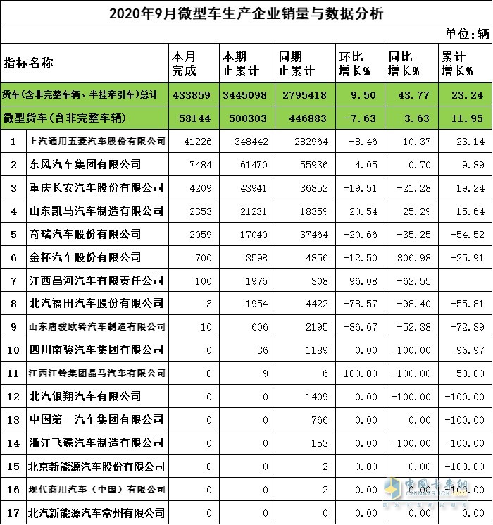 2020年9月微卡企業(yè)銷(xiāo)量與數(shù)據(jù)分析