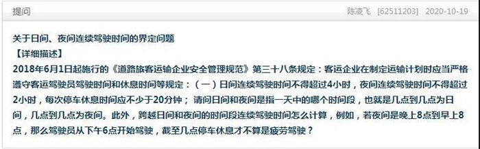 問:2018年6月1日起施行的《道路旅客運輸企業(yè)安全管理規(guī)范》第三十八條規(guī)定:客運企業(yè)在制定運輸計劃時應當嚴格遵守客運駕駛員駕駛時間和休息時間等規(guī)定:(一)日間連續(xù)駕駛時間不得超過4小時,夜間連續(xù)駕駛時間不得超過2小時,每次停車休息時間應不少于20分鐘;請問日間和夜間是指一天中的哪個時間段,也就是幾點到幾點為日間,幾點到幾點為夜間。此外,跨越日間和夜間的時間段連續(xù)駕駛時間怎么計算,例如,若夜間是晚上8點到早上8點,那么駕駛員從下午6點開始駕駛,截至幾點停車休息才不算是疲勞駕駛?