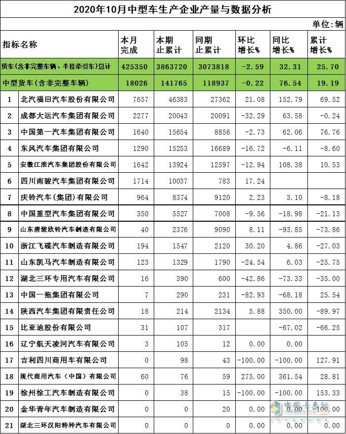 2020年10月份中型貨車完成產(chǎn)量18026,環(huán)比增長-0.22%,同比增長76.54%,累計增長19.19%。排名前三的企業(yè)為北汽福田汽車股份有限公司、成都大運汽車集團(tuán)有限公司、四川南駿汽車集團(tuán)有限公司。