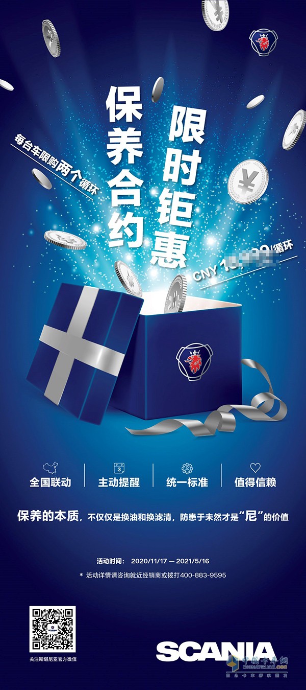 據(jù)了解,斯堪尼亞本次提供的服務(wù)福利稱為保養(yǎng)合約,除了限時(shí)特惠之外,四大亮點(diǎn)讓您以更優(yōu)惠的價(jià)格,享受不變的專業(yè)品質(zhì)服務(wù)。