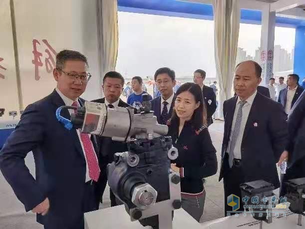 中國一汽總經(jīng)理助理、一汽解放董事長黨委書記胡漢杰在克諾爾市場及傳播經(jīng)理劉嘉蓉的引導(dǎo)下參觀克諾爾展區(qū)
