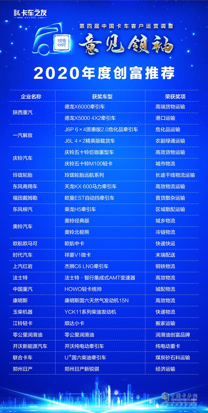從這個(gè)視覺(jué)維度出發(fā),卡友的意見(jiàn)對(duì)于整車(chē)企業(yè)的發(fā)展至關(guān)重要。結(jié)合全年度在各大卡車(chē)行業(yè)細(xì)分領(lǐng)域的深度調(diào)查,代表權(quán)威專家、物流企業(yè)以及不同卡友的中肯評(píng)價(jià)及推薦意見(jiàn),在第四屆“卡車(chē)客戶運(yùn)營(yíng)調(diào)查——中國(guó)卡車(chē)意見(jiàn)領(lǐng)袖頒獎(jiǎng)盛典”中頒發(fā)了年度推薦車(chē)型、年度推薦動(dòng)力、油品及輪胎等系列獎(jiǎng)項(xiàng)。可以預(yù)見(jiàn)的是,獲得這些榮譽(yù)的商用車(chē)企業(yè),必將繼續(xù)載譽(yù)前行,創(chuàng)造出讓更多行業(yè)客戶喜歡的產(chǎn)品,與此同時(shí),這些系列榮譽(yù)的授予,也為整個(gè)商用車(chē)行業(yè)的正向發(fā)展帶來(lái)可資借鑒的思想風(fēng)潮和現(xiàn)實(shí)范本。