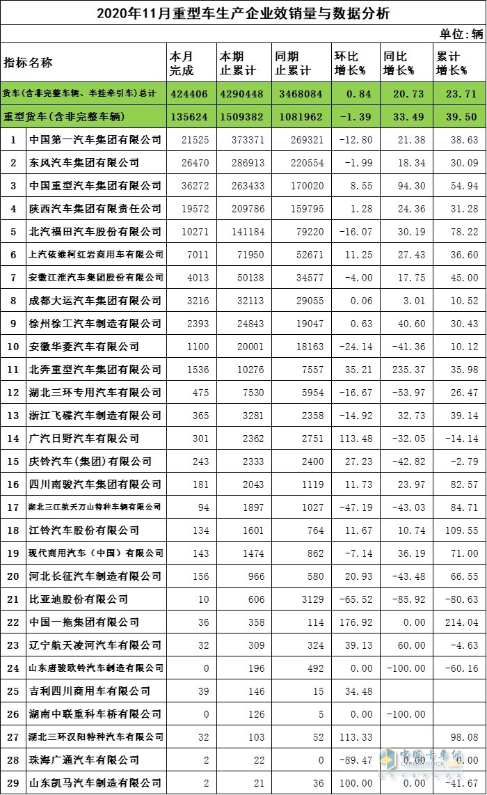 2020年11月重卡企業(yè)銷量與數(shù)據(jù)分析