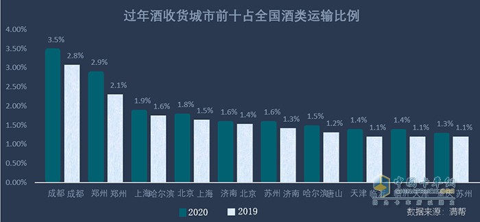 以過年酒收貨量排名第一的成都為例,今年較去年收貨量占比同比提升了25%,第二名鄭州提升了38%,上海、北京排名均提升一位,上升至第三、第四位,上海收貨量占比同比提升了27%,北京提升了29%。過年酒收貨前十城市中,蘇州變化最為顯著,從第十位上升至第六位,收貨量占比同比提升45%。唐山去年排名第七位,今年則跌出前十。哈爾濱占比變化很小,但由于其他城市今年流向更為集中,導(dǎo)致其排名從去年的第三,跌至今年的第七。