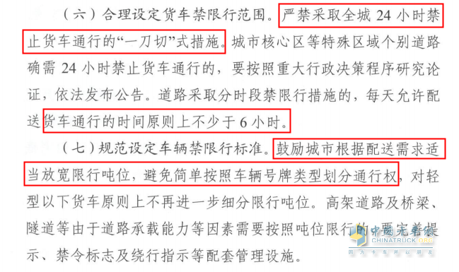 1、嚴(yán)禁采取全城24小時(shí)禁止貨車通行的“一刀切”式措施。城市核心區(qū)等特殊區(qū)域個(gè)別道路確需24小時(shí)禁止貨車通行的,要按照重大行政決策程序研究論證,依法發(fā)布公告,道路采取分時(shí)段禁限行措施的,每天允許配送貨車通行的時(shí)間原則上不少于6小時(shí)。