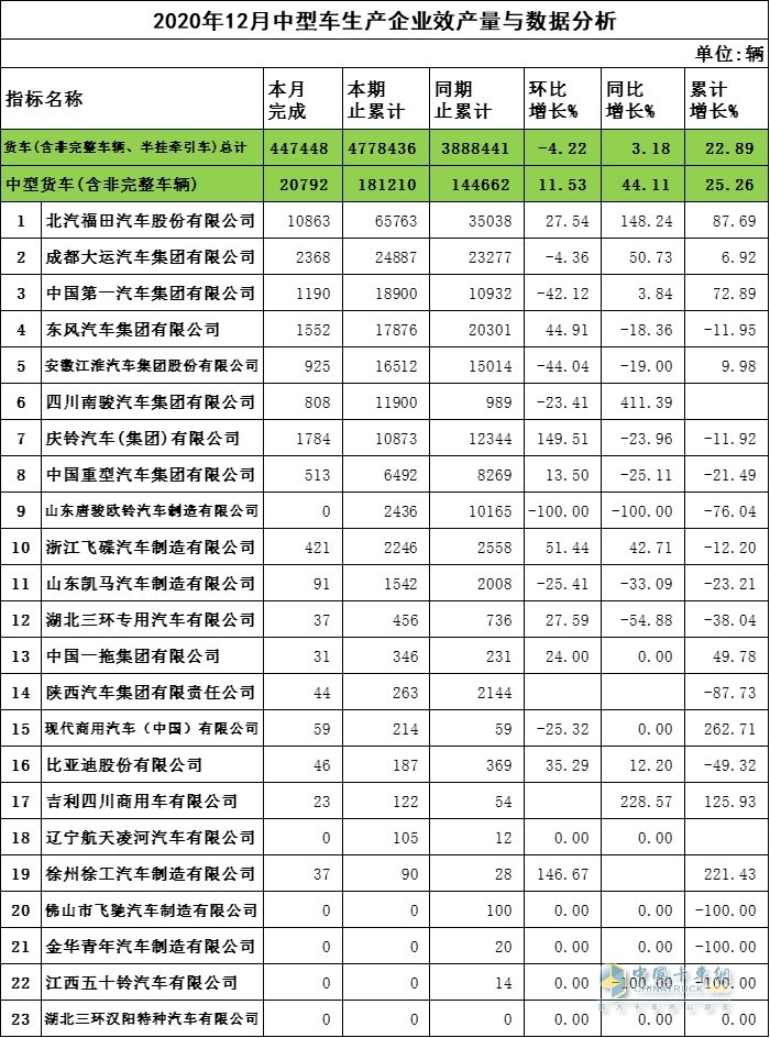 2020年12月份中型貨車完成產量20792,環(huán)比增長11.53%,同比增長44.11%,累計增長25.26%。排名前三的企業(yè)為北汽福田汽車股份有限公司、成都大運汽車集團有限公司、東風汽車集團有限公司。