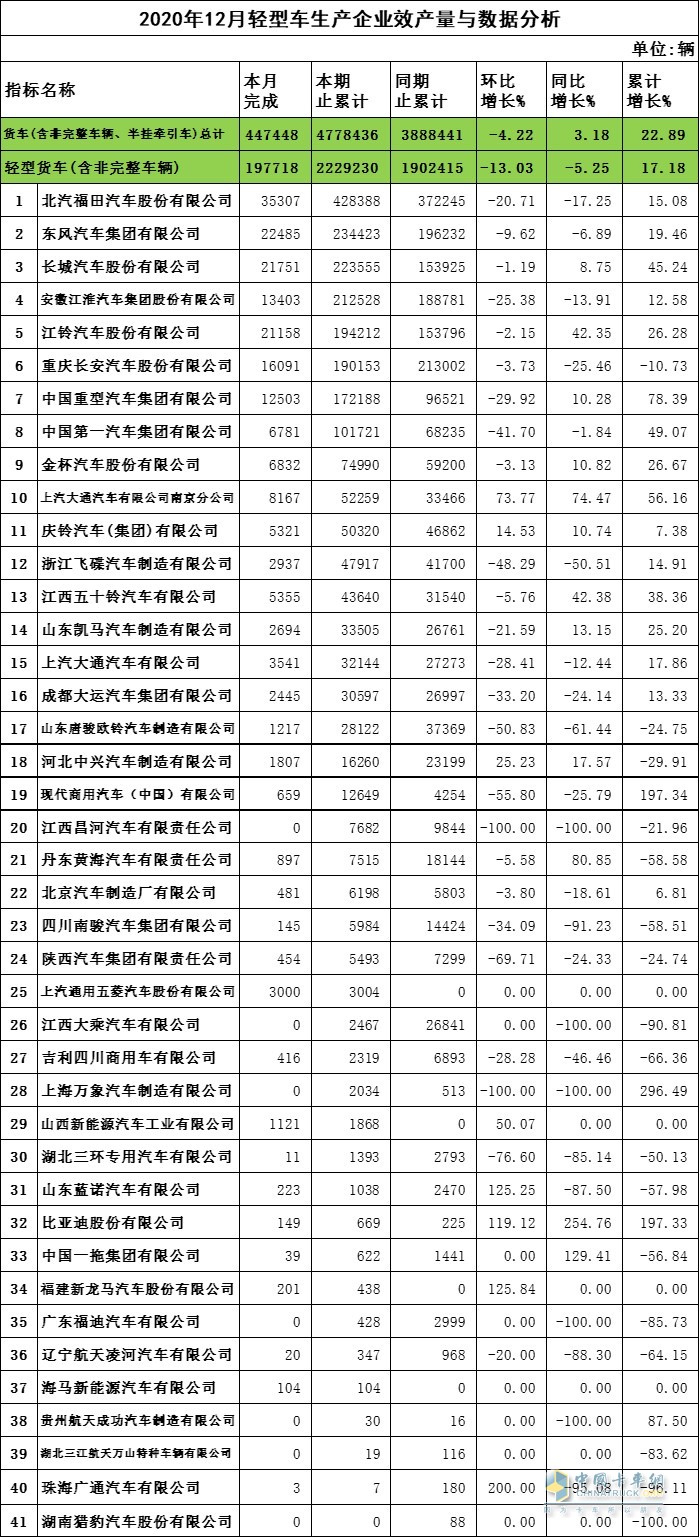2020年12月輕卡企業(yè)產(chǎn)量與數(shù)據(jù)分析