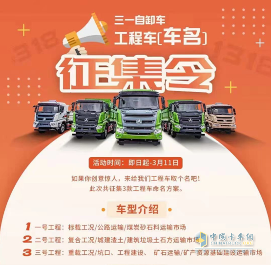 從三一自卸車發(fā)出的工程車車名“征集令”可以看到,將于3月18日上市的工程車共有三款,分別針對標載、復合、重載不同工況打造,可以滿足公路運輸、煤炭砂石料運輸、城建渣土、建筑垃圾運輸、坑口、工程建設、礦石運輸各類運輸市場需求,標志性的三一LOGO和“斯堪尼亞經(jīng)典元素”應有盡有,“歐系”線條更符合年輕司機的審美。