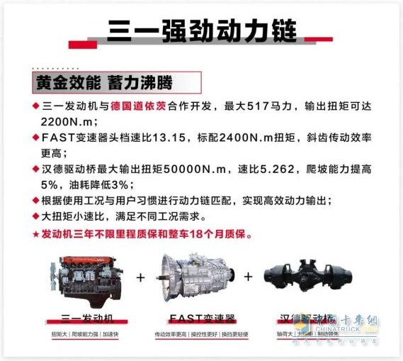 作為工作伙伴,首先要實力可靠,才能贏得用戶信賴。在三一重工本身“世界級”研發(fā)、制造、服務能力加持下,大家對新車“產(chǎn)品力”自然無需多慮。包括此前三一與德國道依茨合作開發(fā)的三一道依茨發(fā)動機,延續(xù)了道依茨在節(jié)油、耐用、動力方面的強勁表現(xiàn),最大517馬力,輸出扭矩可達2200N·m,同時還推出“三年不限里程質(zhì)保”??梢哉f,“歐系血液”+給力服務為車輛帶來了更可靠的出勤保障,筆者猜測部分新車將繼續(xù)搭載由三一發(fā)動機+法士特變速器+漢德橋組成的黃金動力鏈。