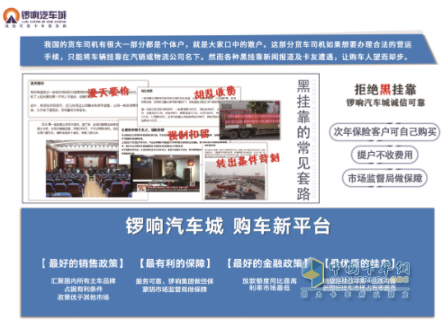 鑼響汽車城,國內(nèi)首創(chuàng)主掛一體銷售,各大主機(jī)廠一站式配套服務(wù),為卡車一級經(jīng)銷商、汽貿(mào)運輸公司免費提供辦公場所、展廳、優(yōu)質(zhì)的金融及保險服務(wù)等資源,并為卡友購車及后期使用等做擔(dān)保,避免了掛靠風(fēng)險。