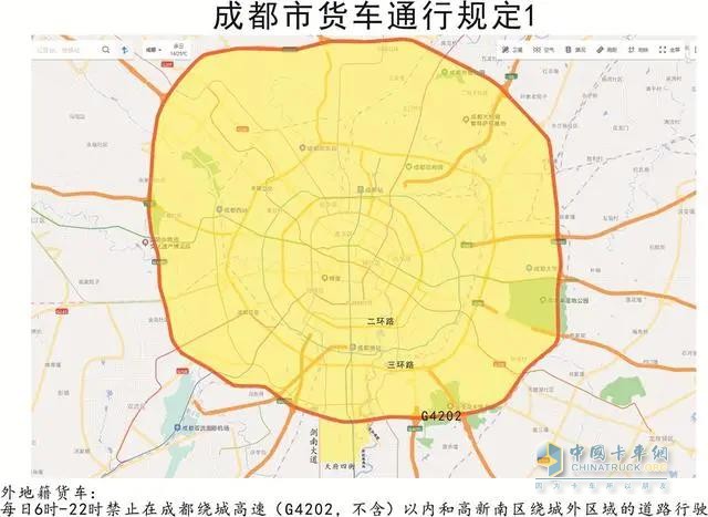 二、外地籍貨車,每日6:00至22:00禁止在成都繞城高速(G4202,不含)以內(nèi)和高新南區(qū)繞城外區(qū)域[成都繞城高速(G4202,不含)以南、劍南大道(含)、天府五街(含)、天府大道中段(含)、天華二路(含)、世紀(jì)城南路(含)、世紀(jì)城路(含)、世紀(jì)城東路(含)、科華南路(含)合圍區(qū)域]內(nèi)的所有道路行駛。