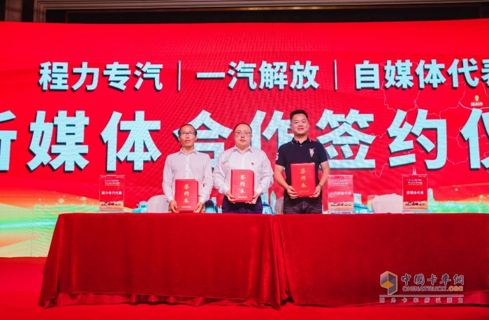 當(dāng)今社會(huì),新媒體的應(yīng)用越來越廣泛,較之于傳統(tǒng)媒體,新媒體具有受眾垂直度高、傳播與更新速度快、成本低、信息量大、內(nèi)容豐富等特點(diǎn),能夠進(jìn)一步提升解放專用車市場(chǎng)聲量。活動(dòng)現(xiàn)場(chǎng),一汽解放汽車銷售有限公司總經(jīng)理助理、專用車部部長(zhǎng)李鐵軍,程力汽車集團(tuán)宣傳中心主任劉佩林,自媒體代表黃鑫共同開啟了一汽解放&程力汽車新媒體合作暨解放隨州經(jīng)紀(jì)人專用放聲新媒體簽約儀式。