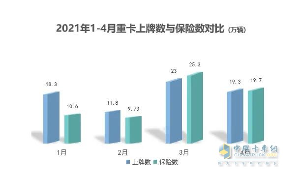 2021年前四個(gè)月,卡車(chē)銷量不斷刷新。從中汽協(xié)公布的數(shù)據(jù)來(lái)看,1-4月重型貨車(chē)銷量72.4萬(wàn)輛,保險(xiǎn)數(shù)據(jù)65.3萬(wàn)輛。上述數(shù)據(jù)顯示,1月和2月的保險(xiǎn)量遠(yuǎn)低于上牌量,但到了3月和4月,保險(xiǎn)數(shù)據(jù)開(kāi)始高于上牌數(shù)據(jù)。