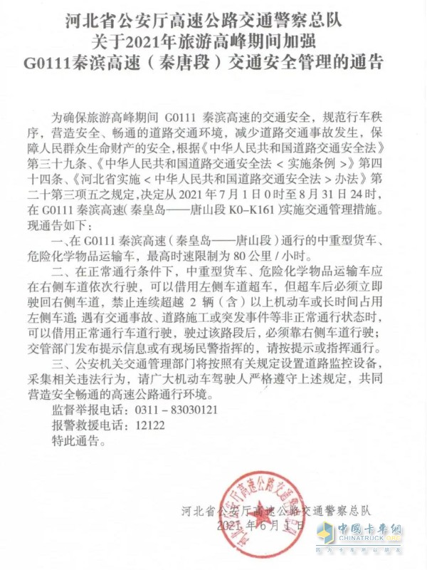 一、在G0111秦濱高速(秦皇島——唐山段)通行的中重型貨車、危險化學(xué)物品運輸車,最高時速限制為80公里/小時。