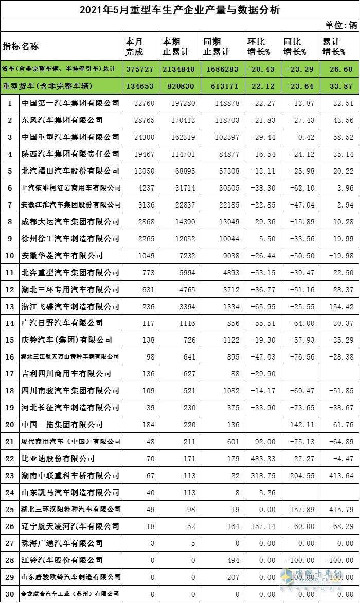2021年5月重卡企業(yè)產量與數(shù)據(jù)分析