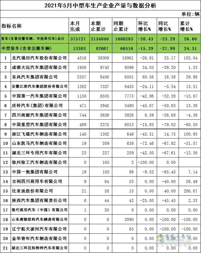 2021年5月份中型貨車(chē)完成產(chǎn)量13303,環(huán)比增長(zhǎng)-15.29%,同比增長(zhǎng)-27.99%,累計(jì)增長(zhǎng)24.31%。排名前三的企業(yè)為北汽福田汽車(chē)股份有限公司、東風(fēng)汽車(chē)集團(tuán)有限公司、成都大運(yùn)汽車(chē)集團(tuán)有限公司。