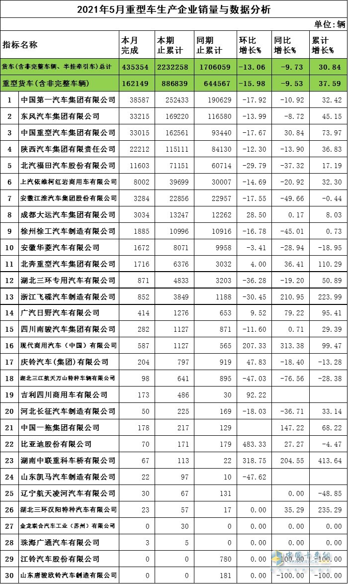 2021年5月重卡企業(yè)銷量與數(shù)據(jù)分析