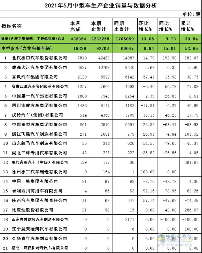 2021年5月份中型貨車完成銷量19229,環(huán)比增長6.94%,同比增長15.01%,累計增長52.86%。排名前三的企業(yè)為北汽福田汽車股份有限公司、成都大運汽車集團(tuán)有限公司、東風(fēng)汽車集團(tuán)有限公司。