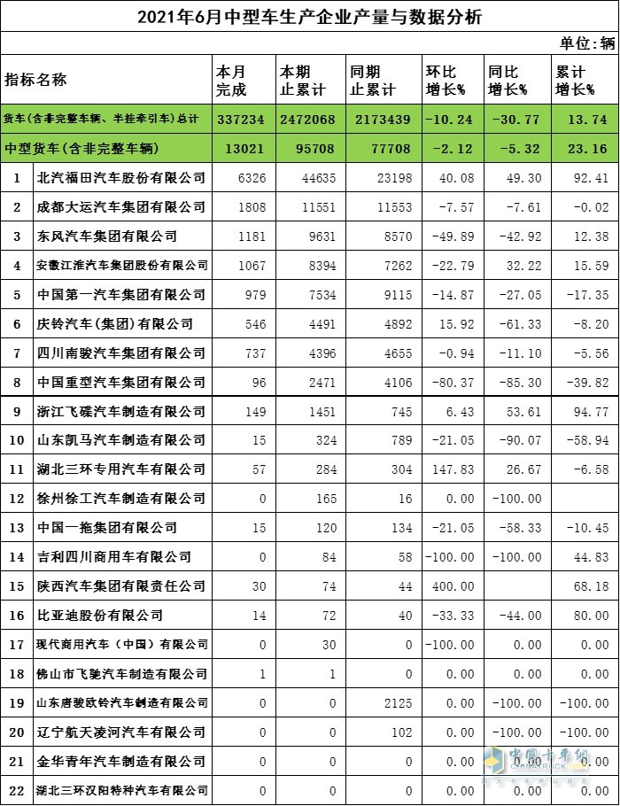 2021年6月份中型貨車(chē)完成產(chǎn)量13021,環(huán)比增長(zhǎng)-2.12%,同比增長(zhǎng)-5.32%,累計(jì)增長(zhǎng)23.16%。排名前三的企業(yè)為北汽福田汽車(chē)股份有限公司、成都大運(yùn)汽車(chē)集團(tuán)有限公司、東風(fēng)汽車(chē)集團(tuán)有限公司。