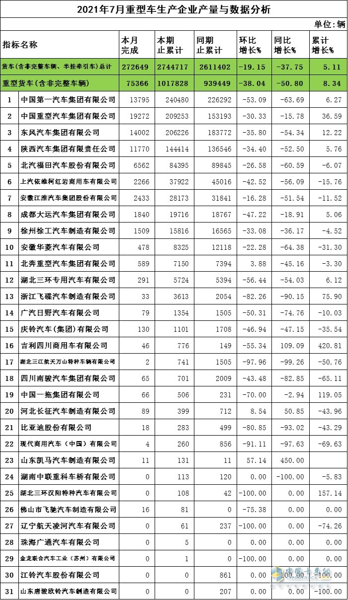 2021年7月重卡企業(yè)產(chǎn)量與數(shù)據(jù)分析