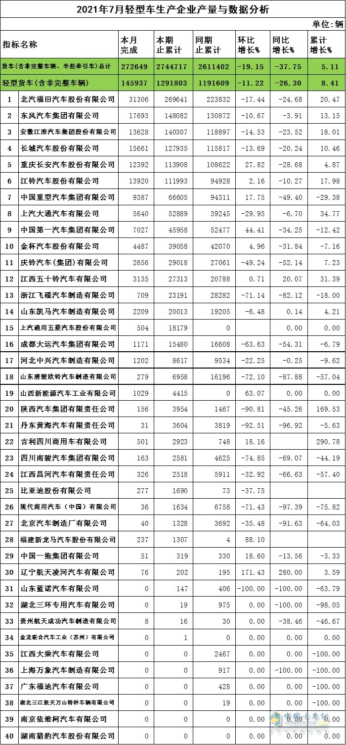 2021年7月輕卡企業(yè)產(chǎn)量與數(shù)據(jù)分析