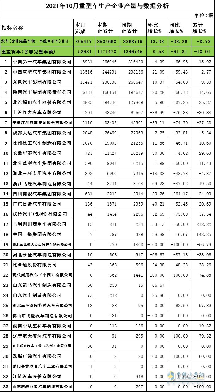 2021年10月重卡企業(yè)產(chǎn)量與數(shù)據(jù)分析
