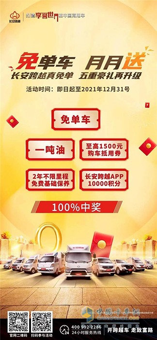 未中獎的用戶注意啦,12月31日將開啟本年度“免單車 月月送”最后一次抽獎,掃描上方活動二維碼即可參與。也許下個幸運兒就是你呢!已經(jīng)購車的用戶,可抽取特等獎“免單車”、一噸油、2年不限里程免費基礎保養(yǎng)、長安跨越APP 10000積分等諸多好禮。準備購車的用戶只要參與活動,就有機會抽取100/500/1000/1500元的大額購車抵用券,超值購車等你來!