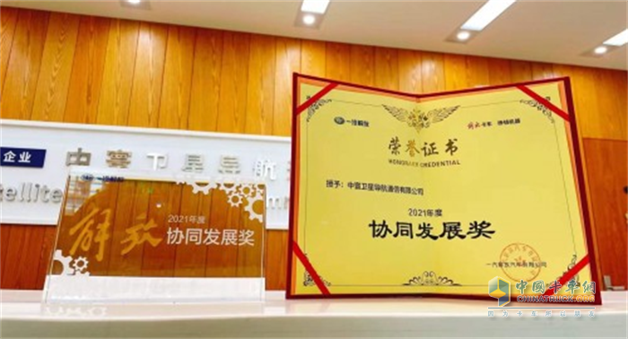 在剛剛召開的一汽解放以“同心戮力克時艱 奮楫篤行拓新程”為主題的2022年新車型推介活動暨采購工作會議中,一汽解放對做出突出貢獻的供應(yīng)商們進行了隆重表彰。中寰衛(wèi)星作為一汽解放商用車智能網(wǎng)聯(lián)深度合作伙伴,獲頒2021年度“協(xié)同發(fā)展獎”。