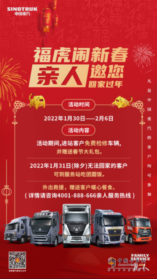 司機和車在路上,車輛的保障也必須如影隨形,作為卡友們的“親人”,中國重汽將于春節(jié)期間,推出“?;Ⅳ[新春,親人邀您回家過年”服務(wù)活動,以誠意致敬在春節(jié)期間仍奮戰(zhàn)在路上的卡友,以卡車界硬核服務(wù)為用戶提供有力保障,攜手卡友一同走入虎虎生威的壬寅虎年!