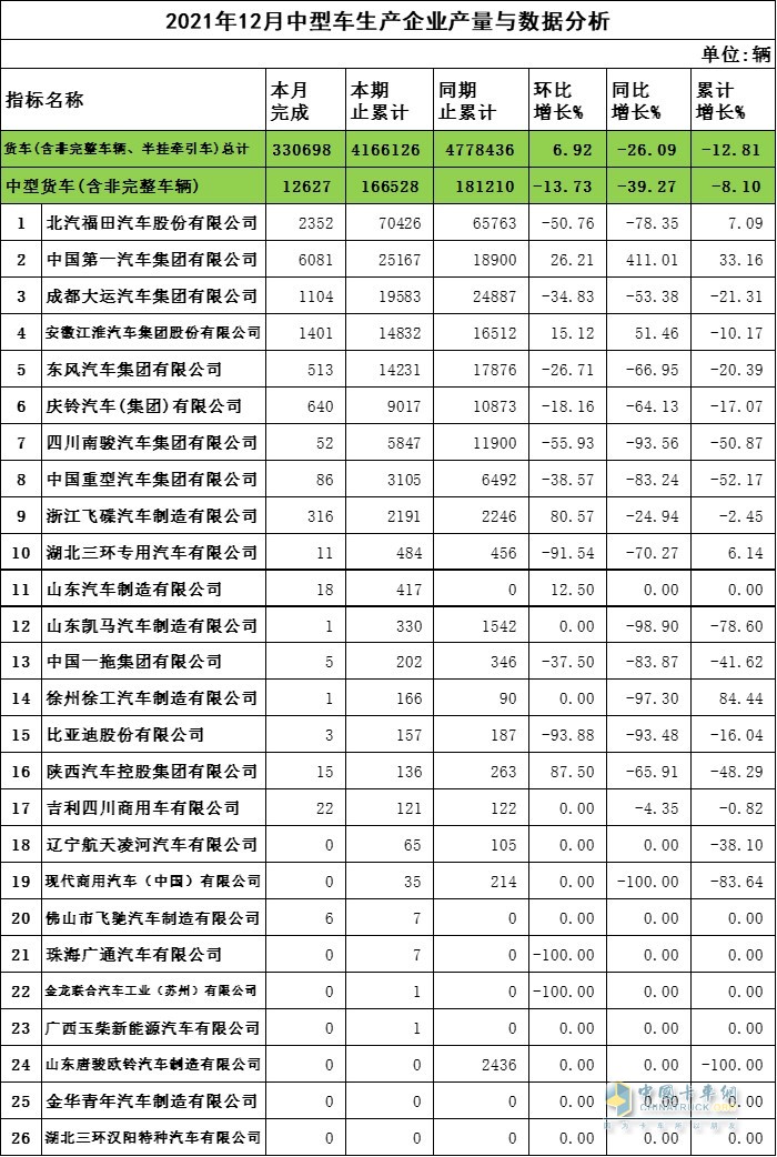 2021年12月份中型貨車完成產(chǎn)量12627,環(huán)比增長-13.73%,同比增長-39.27%,累計增長-8.1%。中國第一汽車集團有限公司、排名前三的企業(yè)為北汽福田汽車股份有限公司、安徽江淮汽車集團有限公司。