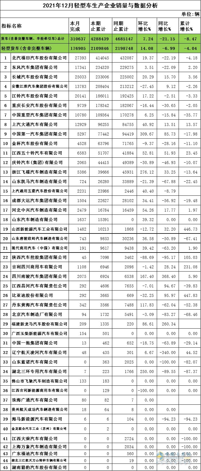 2021年12月輕卡企業(yè)銷量與數(shù)據(jù)分析