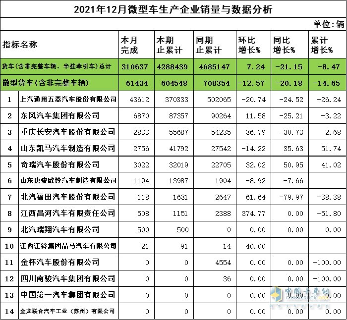 2021年12月微卡企業(yè)銷量與數(shù)據(jù)分析