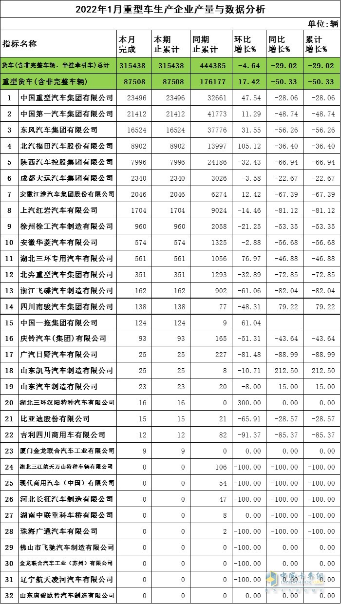 2022年1月重卡企業(yè)產(chǎn)量與數(shù)據(jù)分析