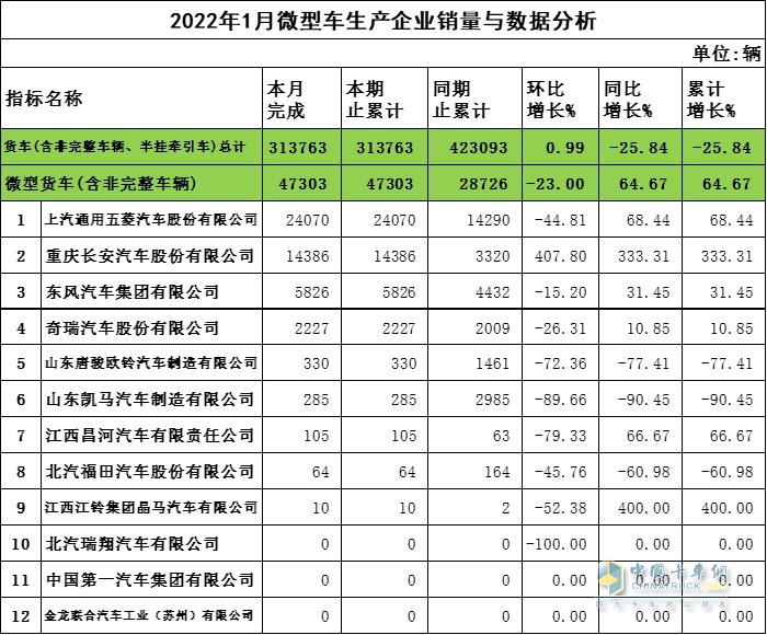 2022年1月微卡企業(yè)銷量與數(shù)據(jù)分析