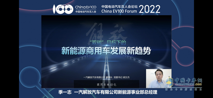 2022年3月25-27日,以“迎接新能源汽車(chē)市場(chǎng)化發(fā)展新階段“為主題的第八屆中國(guó)電動(dòng)汽車(chē)百人會(huì)論壇在線(xiàn)上召開(kāi),本屆論壇共開(kāi)設(shè)14場(chǎng)會(huì)議,聚焦行業(yè)熱點(diǎn),探索發(fā)展趨勢(shì)。3月27日,一汽解放新能源事業(yè)部總經(jīng)理季一志代表一汽解放在商用車(chē)可持續(xù)發(fā)展論壇發(fā)表了主題為《“雙碳”目標(biāo)下的新能源商用車(chē)發(fā)展新趨勢(shì)》的演講。