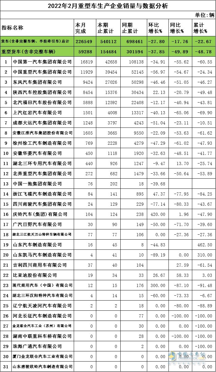 2022年2月重卡企業(yè)銷量與數(shù)據(jù)分析